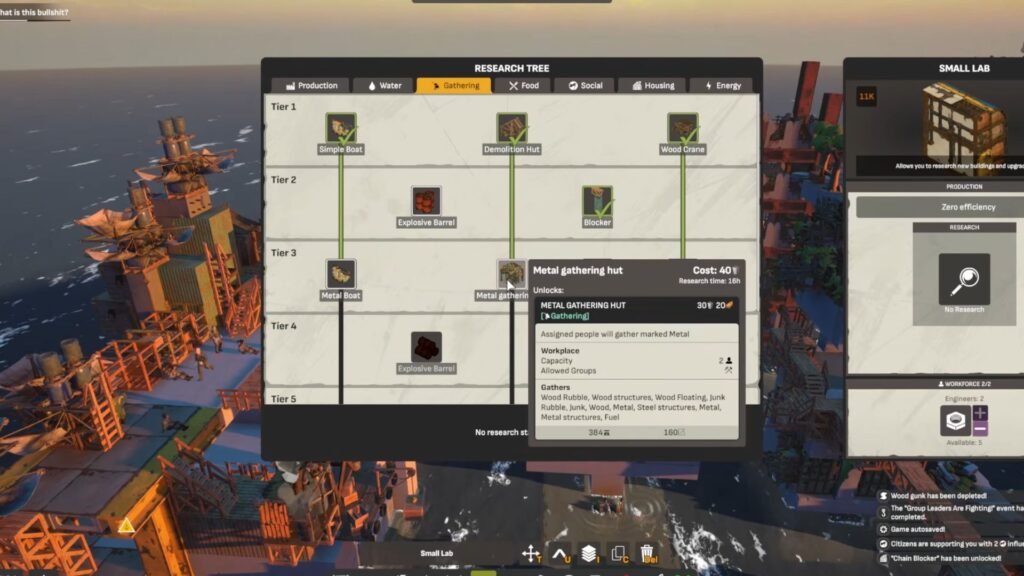 But while scrolling through the research tree, some of the research skills that help gather metal caught my eye. In Tier 3 of the Gathering tab, you will find two unique skills to unlock: the metal crane and the metal gathering hut.​