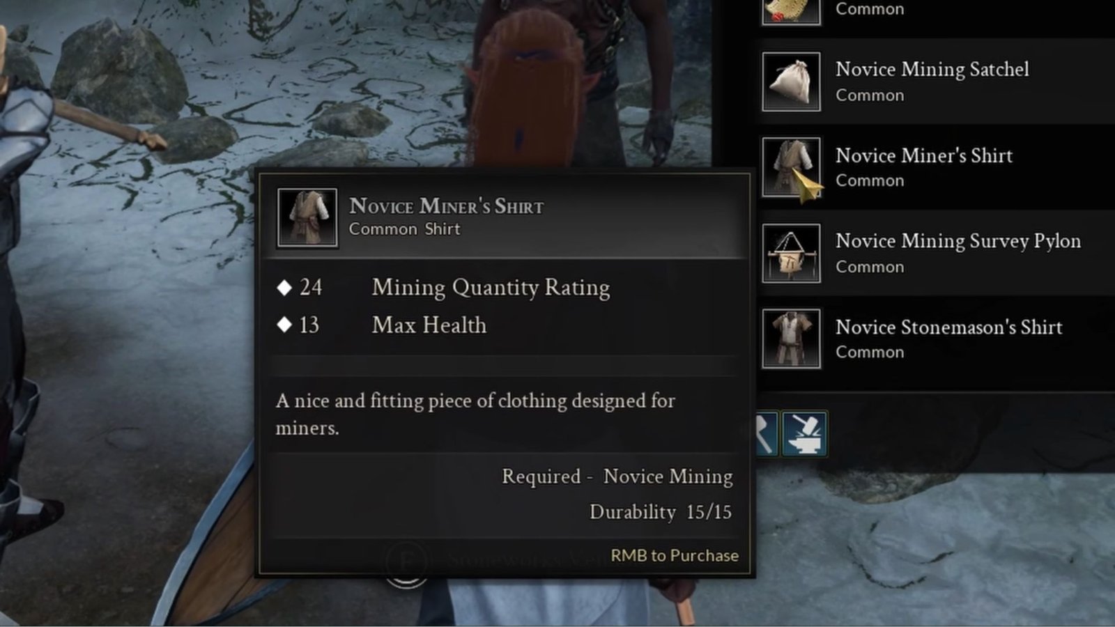 You can increase your mining efficiency by investing in Artisan Mining Gear items. These items can be purchased from various Mining Vendors spread throughout the game’s map. In the early game stages, when you are a Mining Novice, you can buy the following gear items from a Stoneworks Vendor or a Laboratory Vendor in your node: