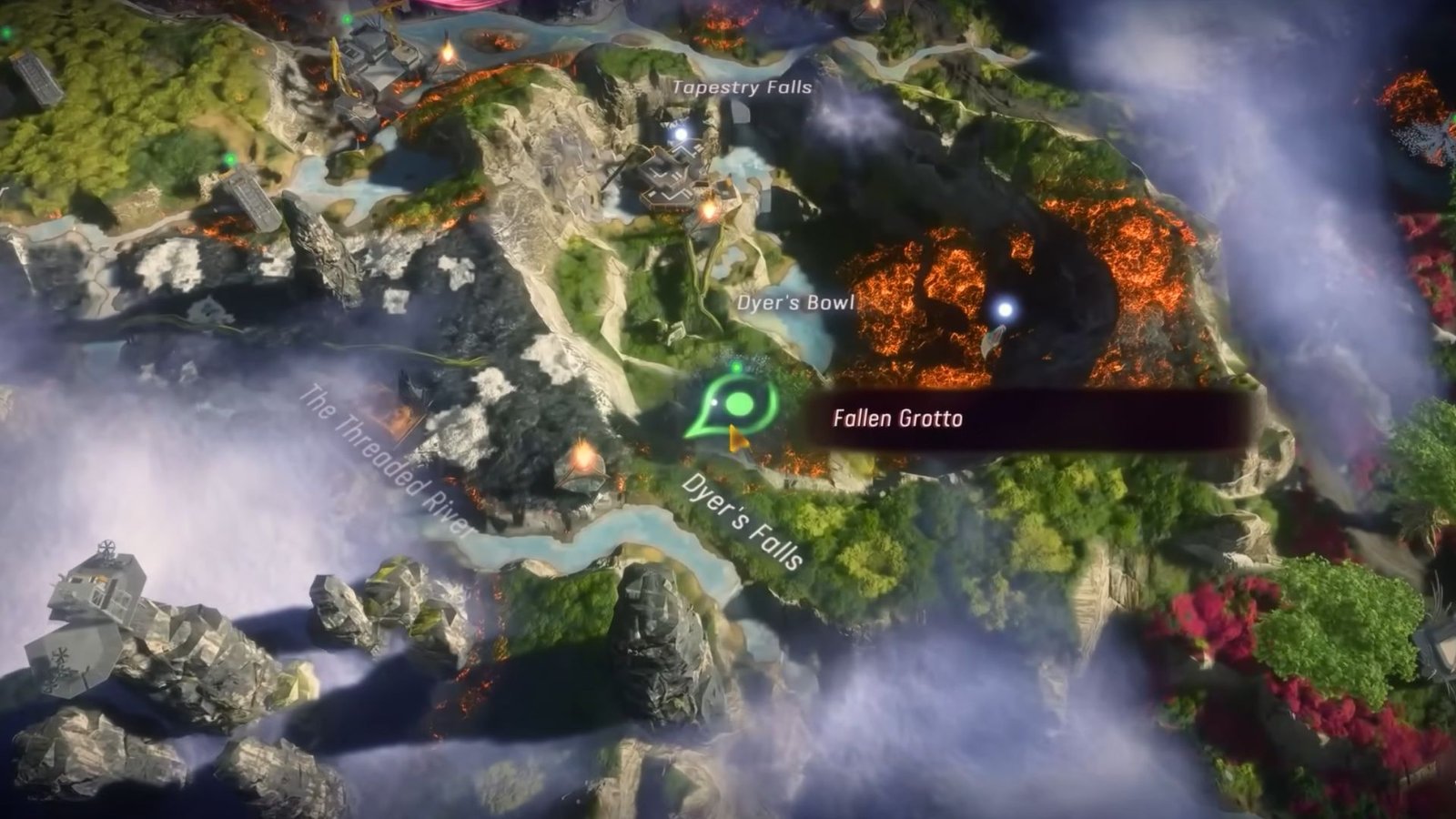 - Make your way to Fallen Grotto between Dyer’s Bowl and Dyer’s Falls in Spinner’s Circle.