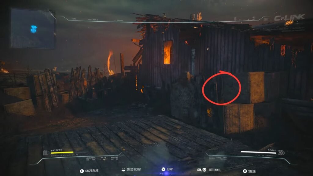 Get on top of this ramp, then make a jump for the gap between the wooden boxes and the wooden planks. You will land in front of an opening under a door. Zip under the opening and park next to the garage door to detonate.