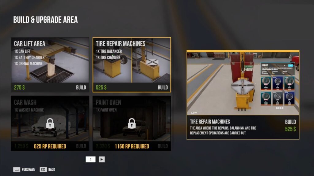 • Next, purchase the Car Lift Area within the same menu, as this will help you hold your car while you check the tires.