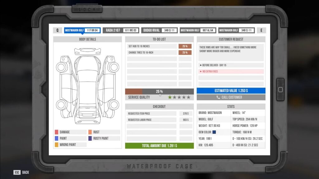 You can pick any type of part, unless the client requests otherwise. Once the parts arrive, you need to fix the new tires on the new rims at the Tire Repair Station. After that, head back to the car and press CTRL. This will bring up the parts menu. Select your new parts one by one and add them in order. Once done, you get to tick off this objective and move on to your next task.