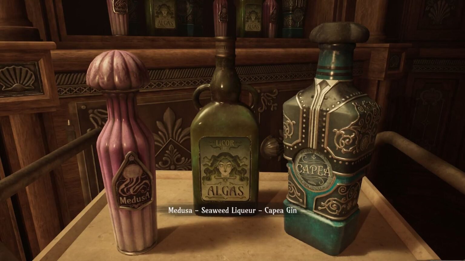 Next, take a look at the three bottles on the tray and note down the names of the alcohol and its corresponding colors. Capea Gin is blue, Medusa is pink, while Seaweed Liquor is green.