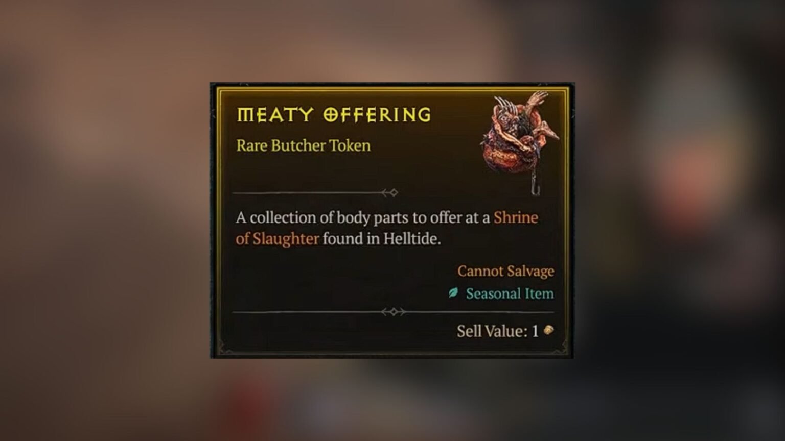 | Description | A collection of body parts to offer at a Shrine of Slaughter found in Helltide. |