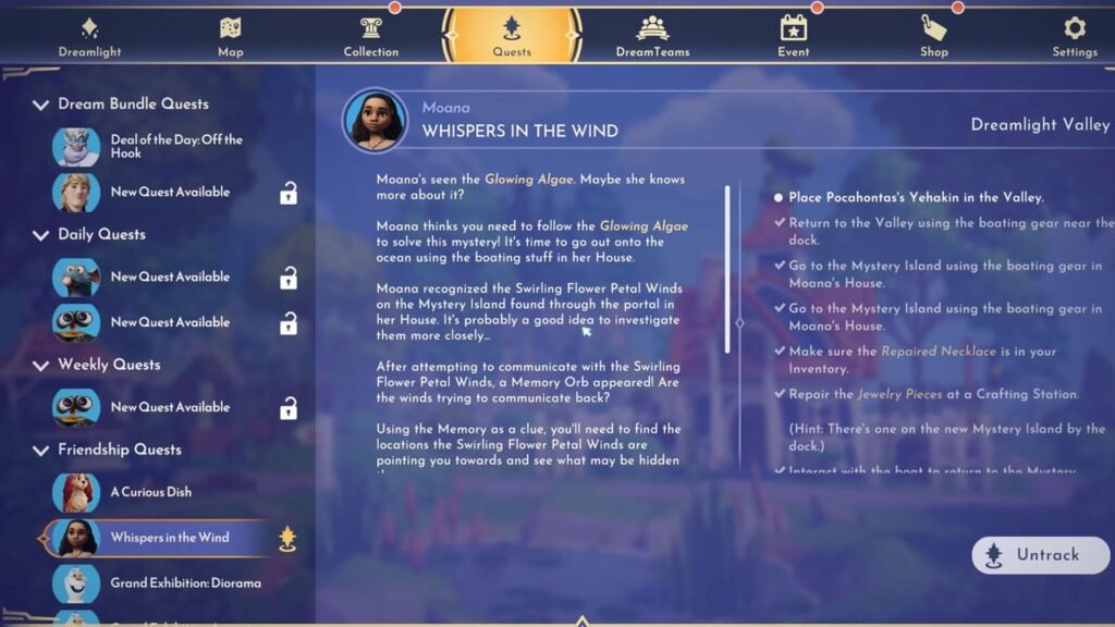 While exploring Dazzle Beach, you need to keep an eye out for glowing algae on the ground. There are no fixed spawn points for the algae to appear. Keep looking around for a sparkling blue object on the floor. Picking it up will start the Whispers in the Wind quest. Then, find Moana in her house and hand over the glowing algae. ​