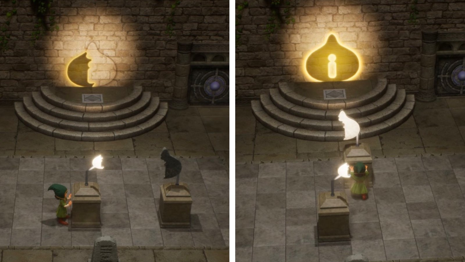 - Solve the light puzzle by lining up the statues so their shadows match the wall symbol.