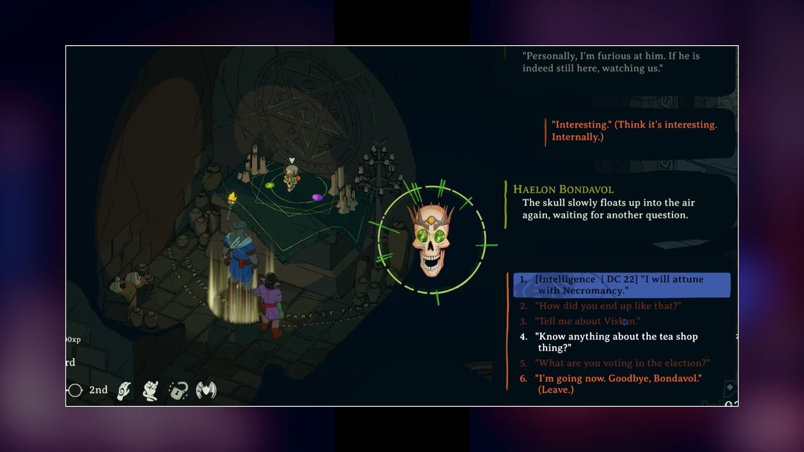 At the northern section of this room is a decorated skull. You can pickpocket the skull to get an Emerald. Then, go through the dialog options until the skull comes to life. The skull will reveal itself to be Bondavl. As you continue to speak to him, you will get the option to attune to Necromancy. This will require DC 22 Intelligence. If successful, you will get the Speak With Dead scroll.