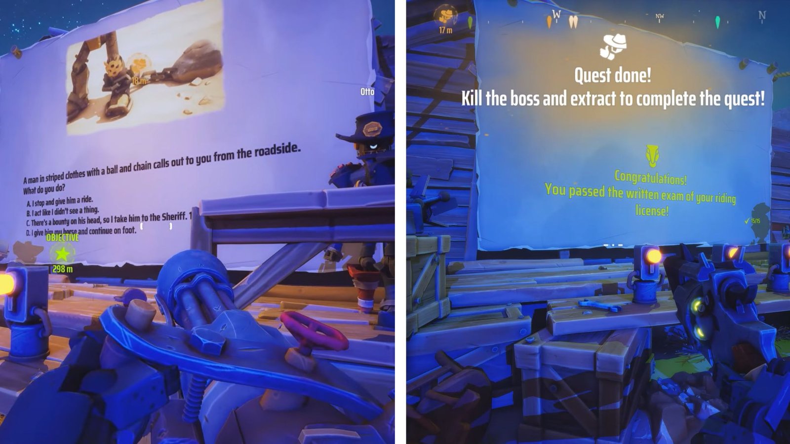 After loading into the Canyon map, follow your main quest objective to find Otto’s ranch. Once there, go up the staircase on the left to reach the large projector screen with Otto nearby. You’ll see 20 questions on the screen; answer at least 15 correctly to complete the quest. ​