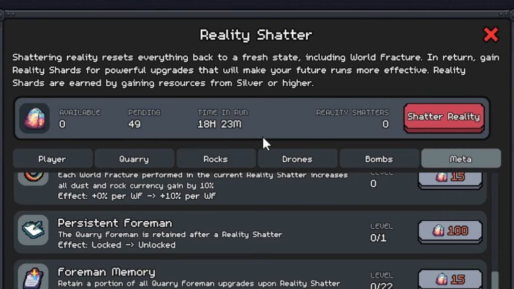 After collecting around 150-300 shards, performing a Reality Shatter will help you unlock some of the basic upgrades under Quarry and Rocks.​