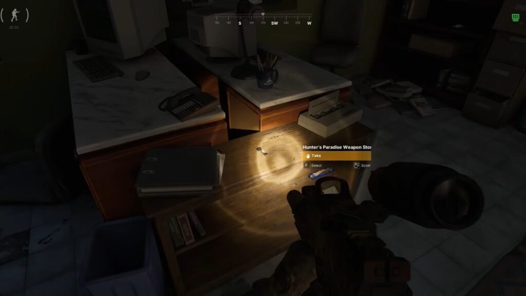 The weapon’s storage is located between the dumping ground, campsite, and motel, at coordinates (160, 168). There is only one fixed spawn point for the key, but it isn’t confirmed for all playthroughs. During my run, I found the key inside the office near the Firing Range at Hunter’s Paradise (160, 168). Just after entering the office, check out the small shelf to your left that has a gray binder on top. There is a key right next to it.