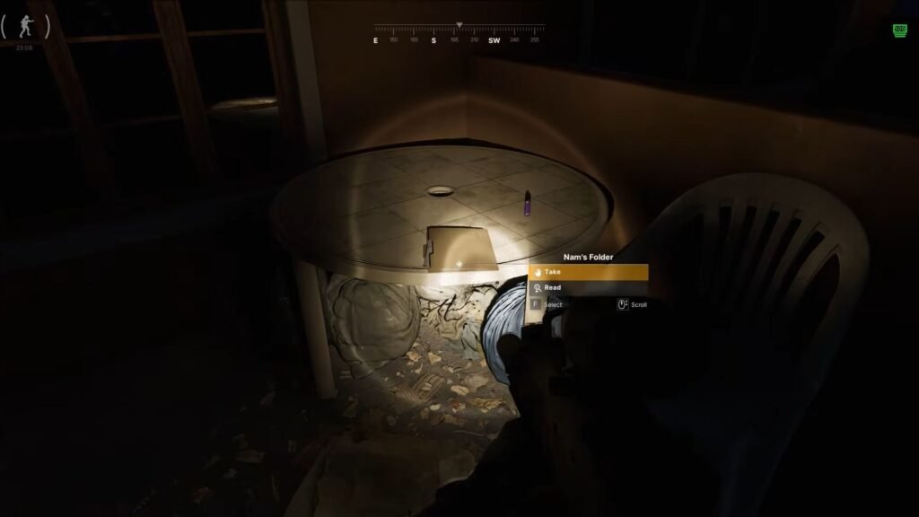 After turning in the report of the empty weapon container, Gunny will require two more items: a note and a folder. For the folder, head over to the motel (160, 167) and check out the outdoor tables. You will spot Nam’s Folder on one of them.