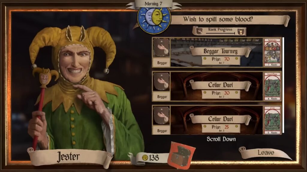 First, you need to select Progression mode. Then, select the Jester at the Inn to find and choose several low-level arenas. Participate in these arenas first to collect points. Also, within the Fight menu, you will spot the Rank Up progression bar. Once this bar is filled up, rest for a night and check the Fight menu again to unlock your beginner tournament – the Beggar Tourney.