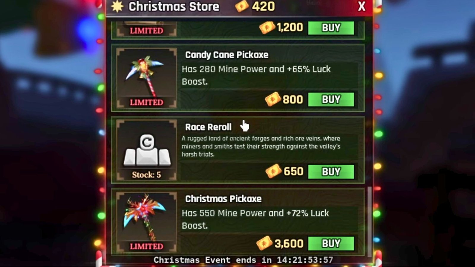 You can buy various potions, totems, limited edition weapon blueprints, limited event Pickaxes, and race rerolls with Xmas Tickets. Specialty weapons and Pickaxes, such as Candy Cane Blade, Candy Cane Pickaxe, and Christmas Pickaxe, make the Christmas Event in the Forge worth the hassle!