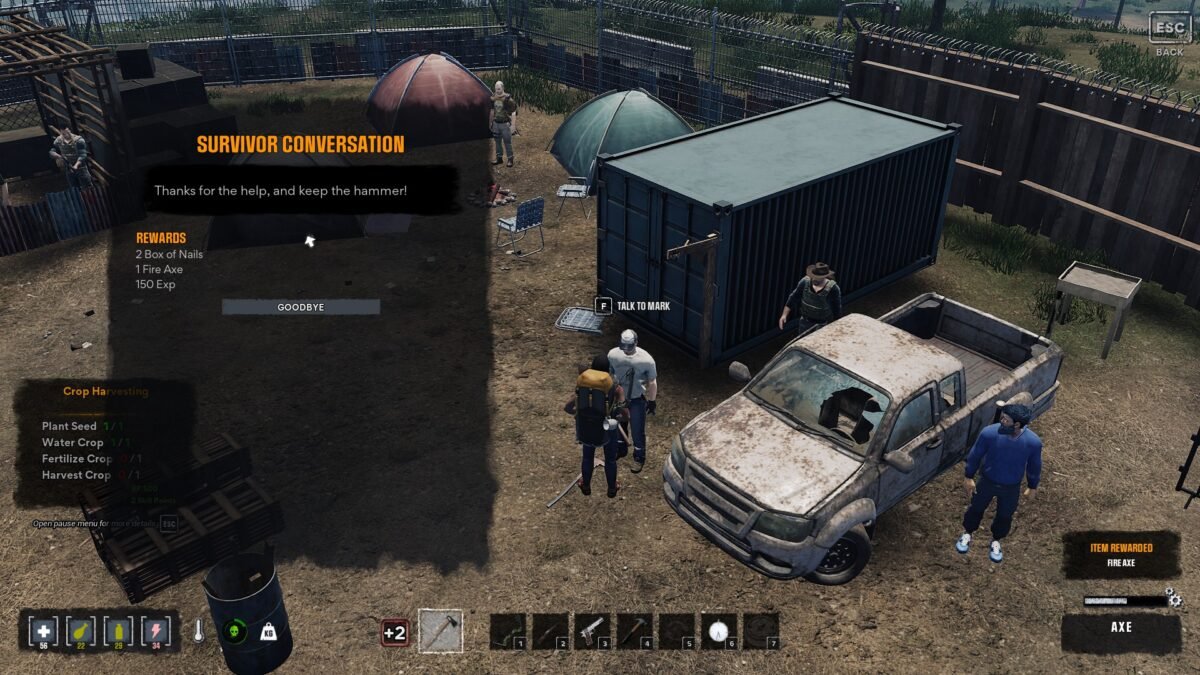 Once the wall is fully repaired, talk to Mark, inside the camp again, and you will get the Fire Axe along with 2 Boxes of Nails and 150 Exp.