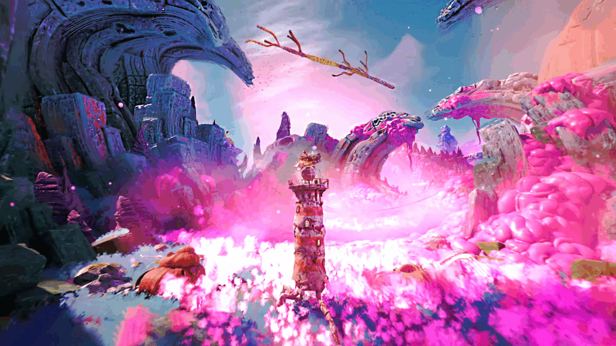 Head down the stairs and keep moving forward until you come across a huge open area. Here, you will find the lighthouse is covered with pink clouds, which allow you to jump even higher than normal.