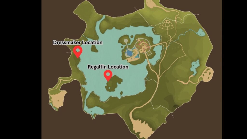 After completing the tutorial with Thea, head over to the Dressmaker NPC found on the western shoreline of Broadleaf Basin, just north of the Catavan Stand. Speaking to them will unlock the Finding the Regalfin side quests. Once accepted, you will find a new quest marker on your map. This will take you to an island in the southwestern section of Azuria’s Mirror Lake.