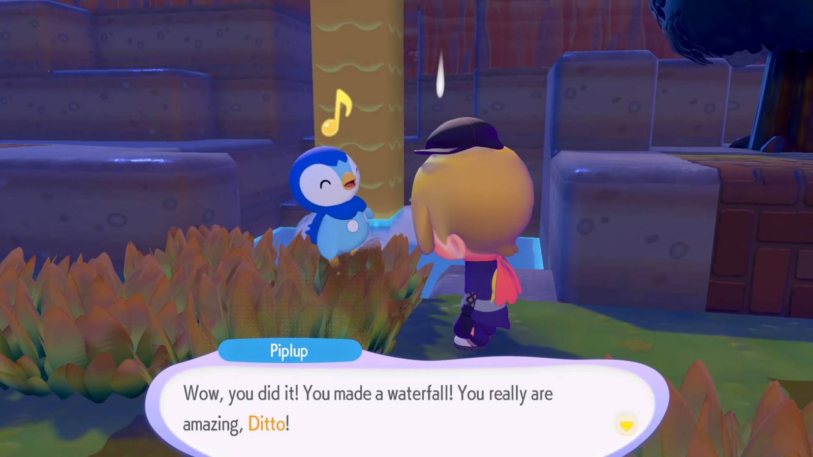 To begin this quest, interact with Piplup, and he will lead you to a new location. Follow the steps below to make your own waterfall: