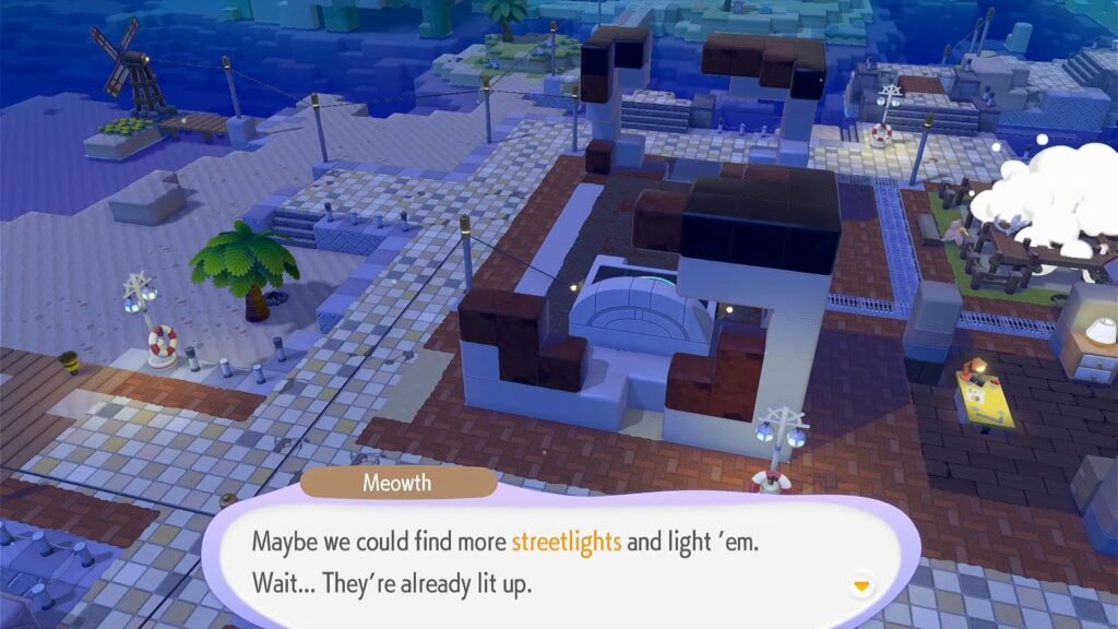 Then, speak to Professor Tangrowth to locate Peakychu, after which you get Peakychu’s request. This requires adding streetlights and utility poles around the area to light up the streets. Continue to add more streetlights around the area until Peakychu moves in next to Mosslax and gives you another request.