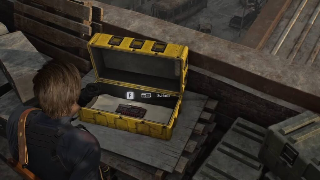 - Continue your way upward to the warehouse rooftop. There you’ll find a yellow crate with a blinking red light containing the Distributor.