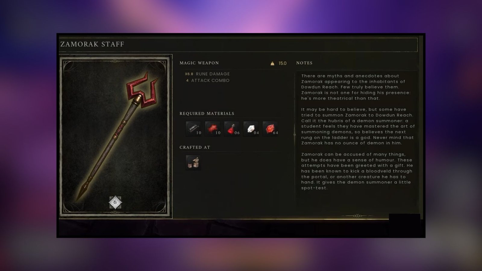 Then, enter the Demon Gate to find the dead Zamorak Mage leaning against the wall in the back of the room. Pick up the last quest item from his body and return to Doric. Hand over the item to him to unlock the Masterwork recipe for the Zamorak Staff.