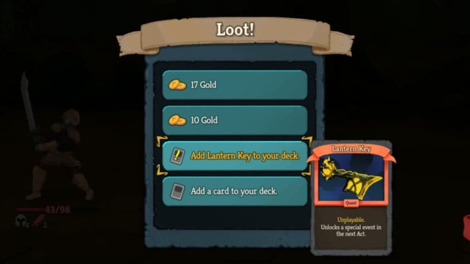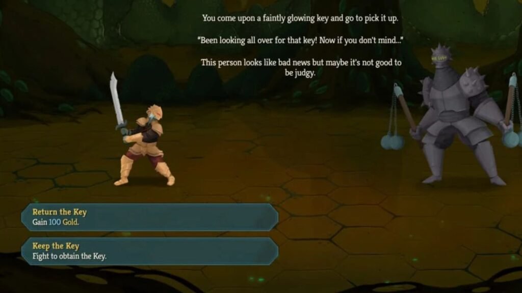 You will get the Lantern Key as a drop for defeating the Mysterious Knight in Act 2 – Hive’s random event. The event triggers when a shiny item is picked up from the floor. If you return the Key, you will gain 100 Gold. But keeping it will start a boss fight. This is a level 6 enemy and will deal 21 damage, so you need to prepare yourself beforehand. Once defeated, you will get random amounts of gold and the Lantern Key card.