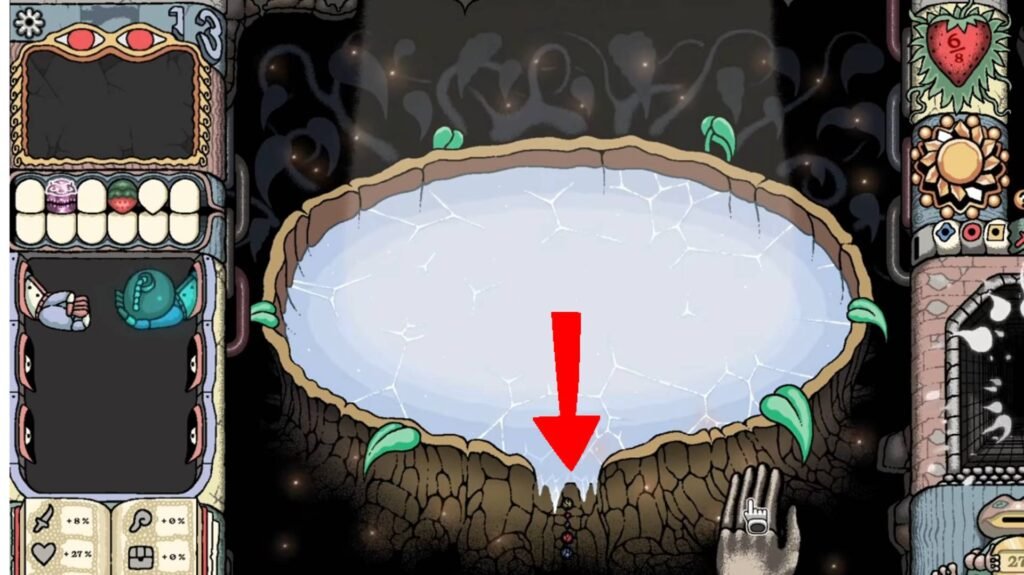 To unlock the second melody, you need to drop an ice cube at the pond where you got the mouthpiece. Once frozen, a pattern of gems will appear on the bark of the tree, which will translate to the following melody: