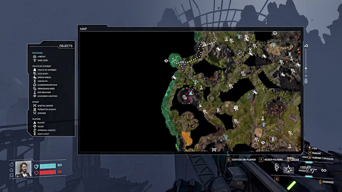 On the map, you can view your Habitat and Base Core. Along with the basics, the map will also help you with Points of Interest, Dead Body, Monolith, Drone Wreck, Underground Cave, Abandoned Base, Geo Scanner, and many Unknown Locations. It also reveals enemies, allies, death spots, player location, and many more.