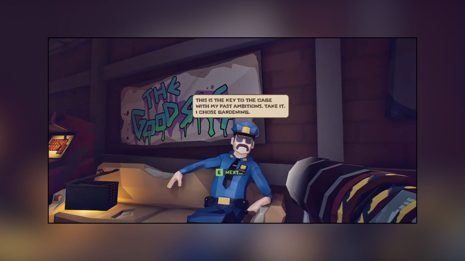 - Speak to the cop in the hideout to collect the gun cage key.