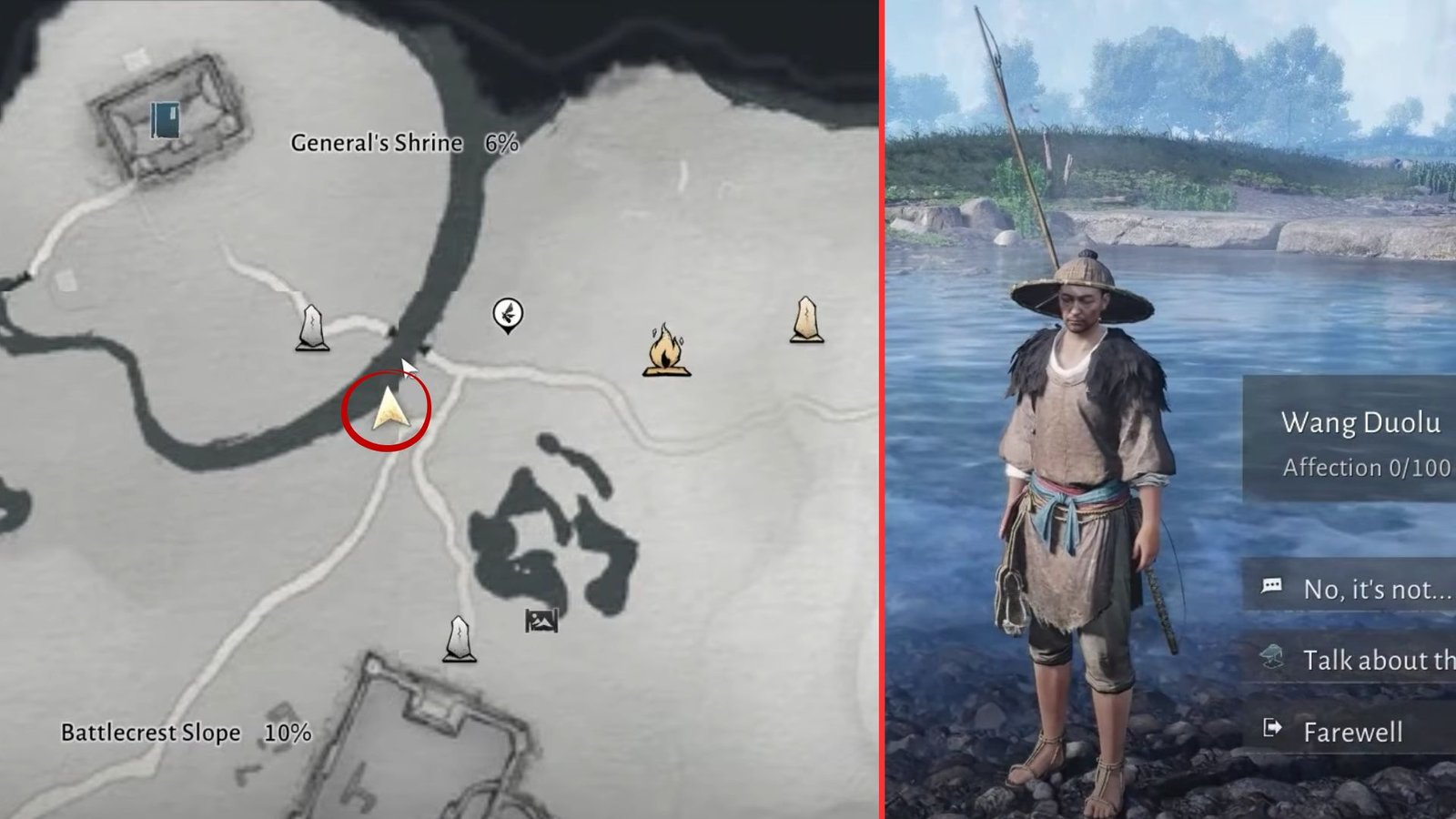 You might be trying with the wrong Wang Duolu. There are two NPCs with that same name in the Qinghe region. One is located to the North of the Shrine, while another is located to the South, near the Boundary Stone of the General’s Shrine. Make sure you’re chatting with one of the South. You can play a fishing mini-game with the Northside Wang, but you’ll need to befriend the Fisherman Wang located to the South to complete General’s Shrine Old Friends.