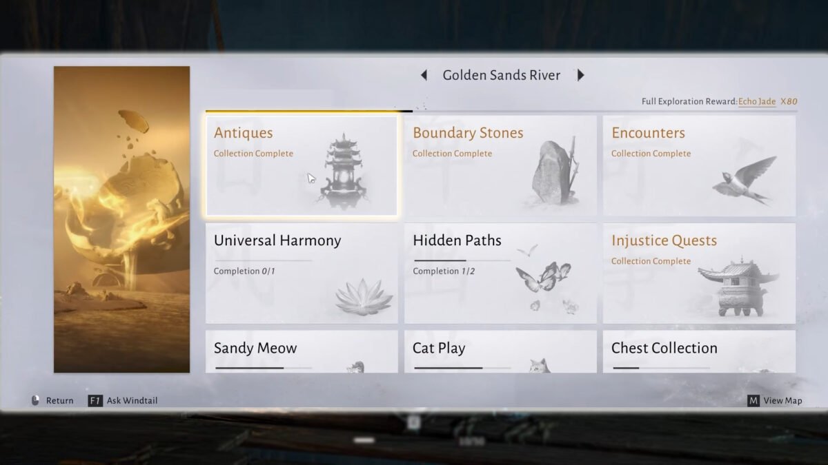 - You can check the progress on the antiques by going into the Sentient Beings section of the Journal and then selecting Golden Sands River.