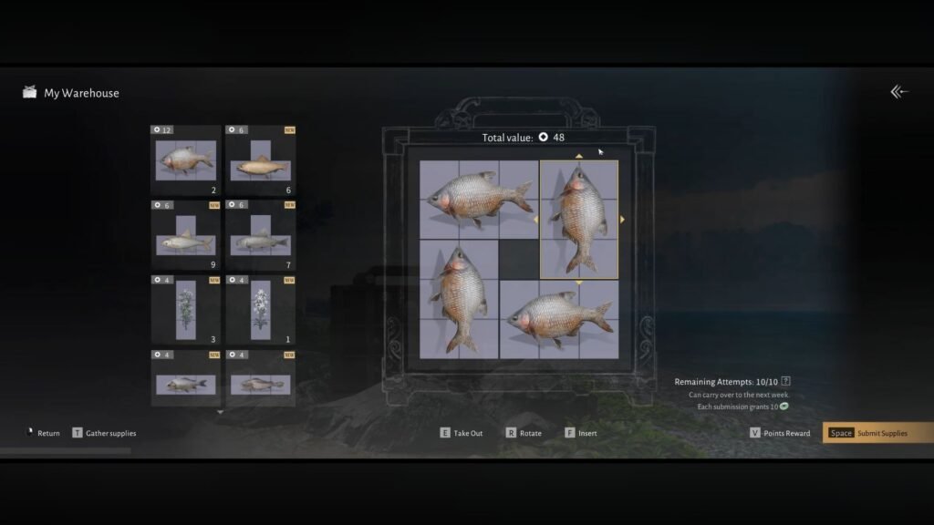 You will need 600 points to get all the rewards during the event, and you only get 10 chances to play the event per week. With the Black Bream, you can place four of them around the warehouse grid to get 48 points per attempt. If you are unsure of how to place them, refer to the image above. That will give you around 480 points per week. Repeat this step the next week to get an extra 480 points, which will bring your total up to 888, which is way beyond the target amount for the event.​