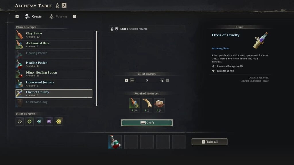 Now that we have the healing requirements out of the way, you need to add buffs to your attacks. Crafting the Elixir of Cruelty will increase damage by 8% and last 15 minutes. To craft the Elixir of Cruelty, you will require the Alchemical Base, a Boar Tusk, and a Pearl. Take them to the Stove and Pot to craft the elixir.