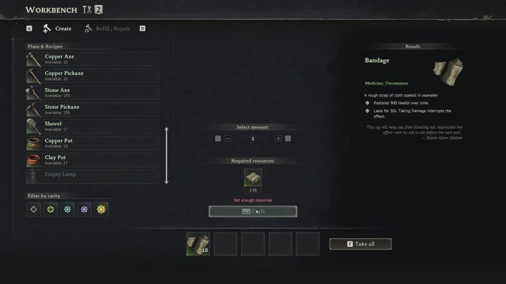 Since this will be your first boss fight, you need to prepare yourself early on. First, stock up on healing items like bandages and health potions, which are pretty easy to make in the early game. If you haven’t crafted any bandages yet, collect Plant Fiber and turn it into Coarse Fabric. Then, use the Coarse Fabric at the Workbench to create a Bandage. I stocked up on around 15 bandages for the fight.
