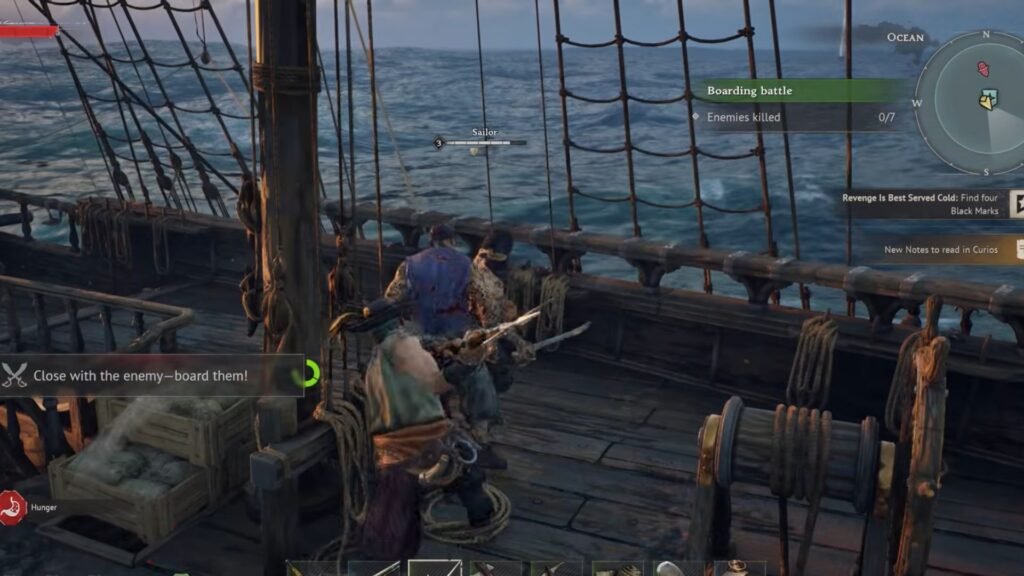 Once your ship has aligned with the enemy ship, walk close to the railing to get the Climb option. You will spot your crew onboarding the enemy ship right about now. Follow them and start killing the enemy crew with your preferred weapon. If you take a look at the right side of your screen, you will get the Boarding Battle objective. For the objective, you need to kill the required crew members to clear the ship.