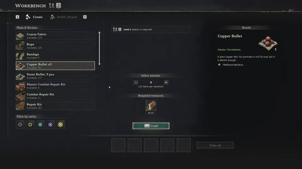 Once you have the workbench, you get to craft and upgrade your weapons here. Most weapons will require wood and copper ingots of varying amounts. Upgrading the guns to epic rarity will require the base gun and the Tumbaga Ingot.