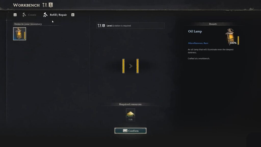 While checking the oil lamp from your inventory or hotbar, keep an eye on the yellow bar beside it. This meter indicates when you need to refuel. If it is empty, you can refuel the oil lamp at the workbench. Head over there and select the ‘Refill/Repair’ option beside the ‘Create’ option. You will require 3x Animal Fat to fill the oil lamp with fuel.